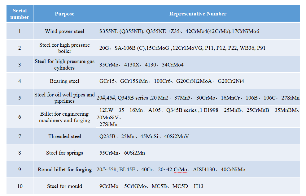 Products are mainly used in machinery manufacturing, power energy, petrochemical and other industries, including large wind power flange, bearings, gears, gear ring, tool and die, and boiler industry for large-caliber boiler tubes and other products.
